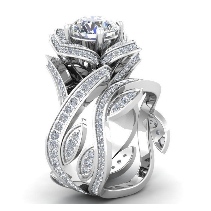 Silver Flower Leaf Round Cut Clear Diamond Wedding Bridal Ring