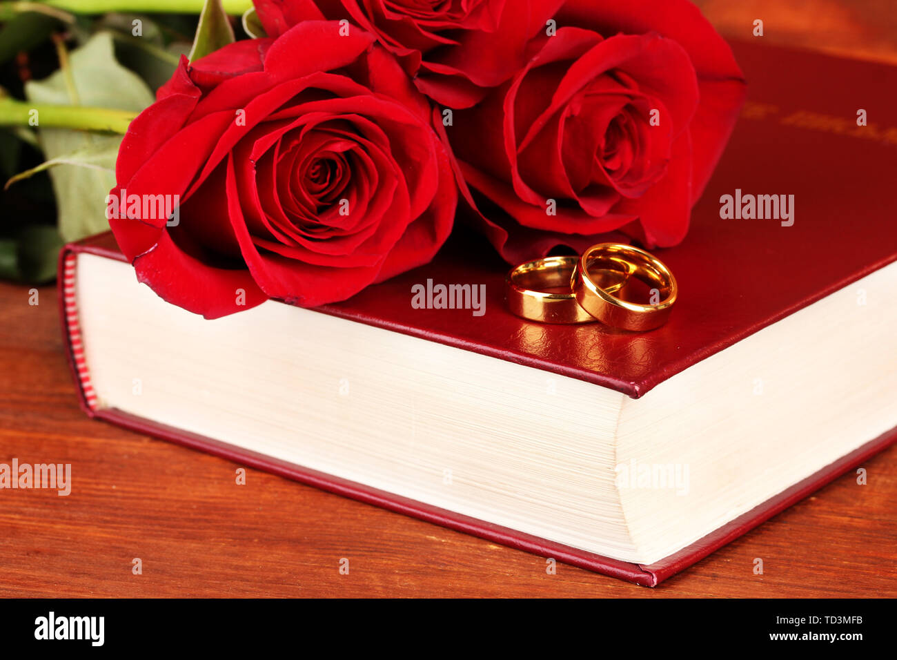 Wedding Rings On Bible With Roses On Wooden Background Stock Photo