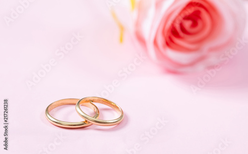 Close Up View Of Golden Wedding Rings And A Blurry Pink Rose Copy