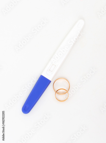 Plastic Pregnancy Test And Two Wedding Rings On The Table Buy