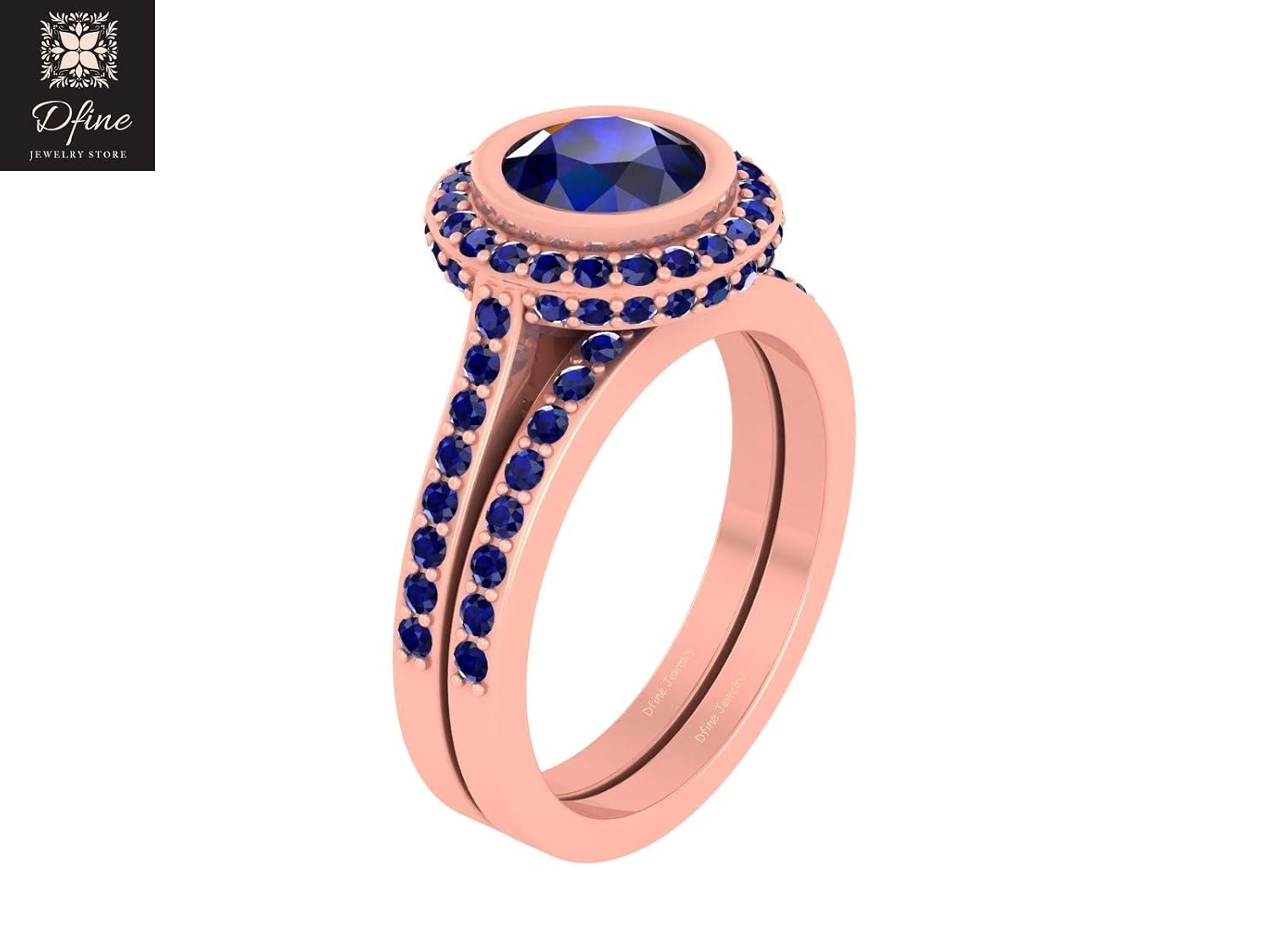 Three Stone Blue Sapphire Bridal Engagement Ring Set Wedding Ring