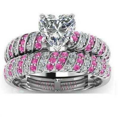 3ct Heart Cut Diamond Pink Stone Bridal Set Engagement Ring 14ct